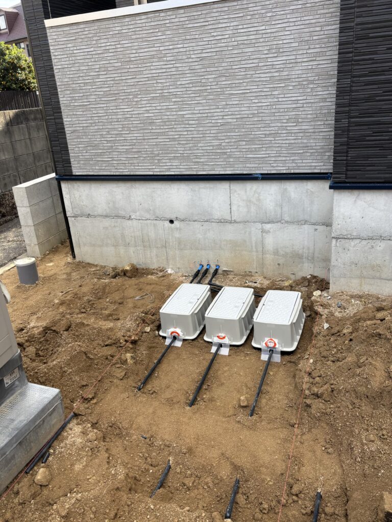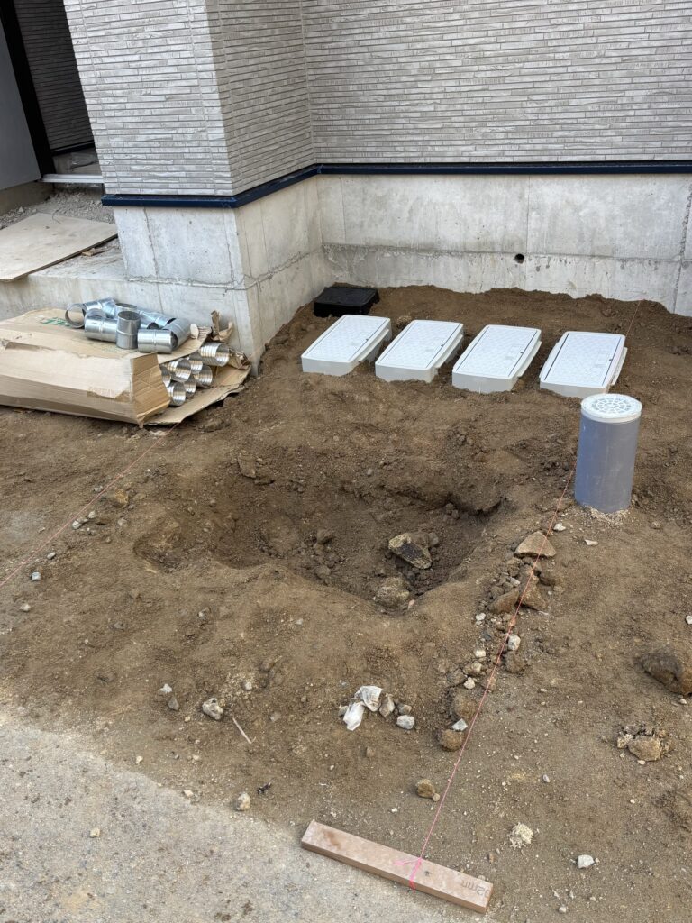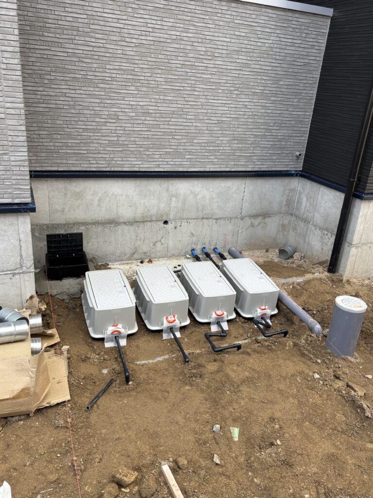 量水器廻りの配管.BOX設置状況です。建物から道路まで勾配がつくので水糸を張って施工しました。外構屋さんと打ち合わせして間違いのないよう慎重に工事を進めます!
